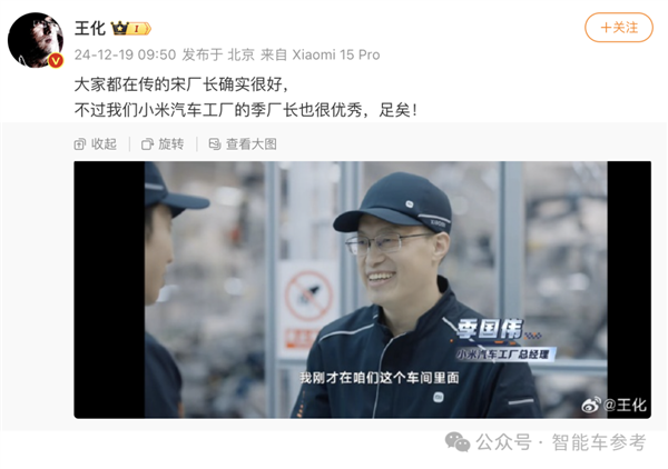 季国伟很少公开亮相,王化回复时用的像片,还是本年撒贝宁拜访小米汽车工场时,季国伟接待先容的视频截图。