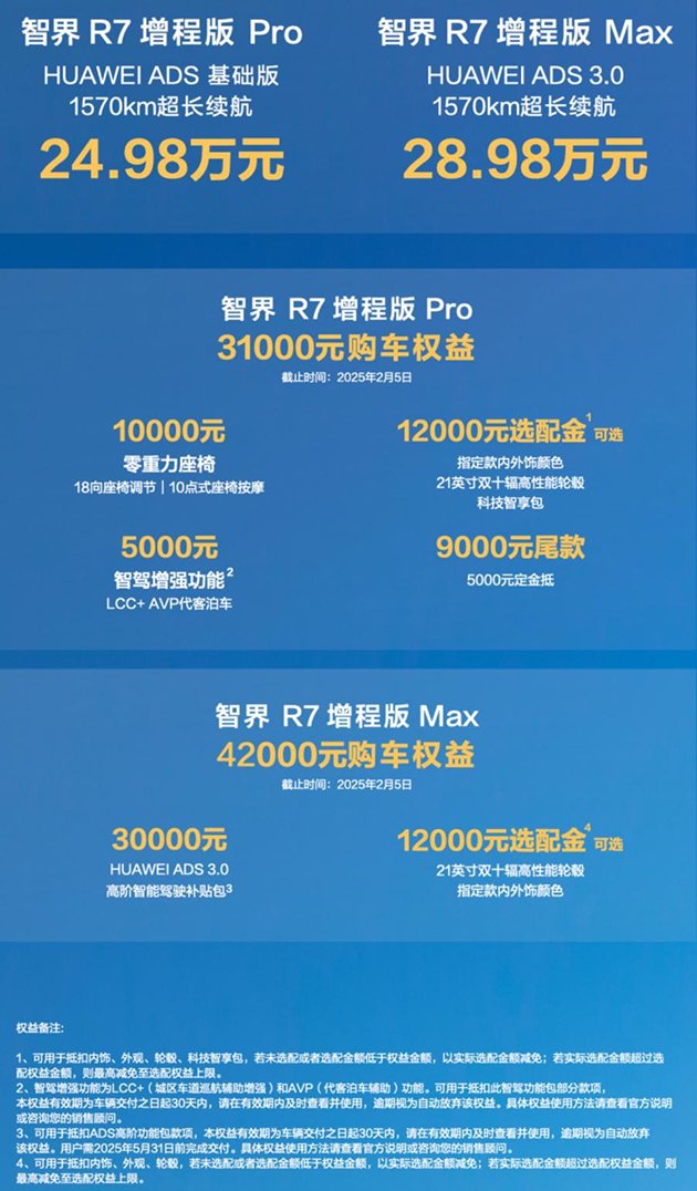 新车型提供两款版型,智界R7增程版Pro售价为24.98万元,即当前定可享受价值31000元购车权力;智界R7 增程版Max售价为28.98万元,即当前定可享受42000元购车权力。即日起,销耗者可在华为商城、鸿蒙智行小才调等渠谈进行订购或预约试驾赌钱赚钱app,进一步感受智界R7增程版的越级实力及极致魔力。